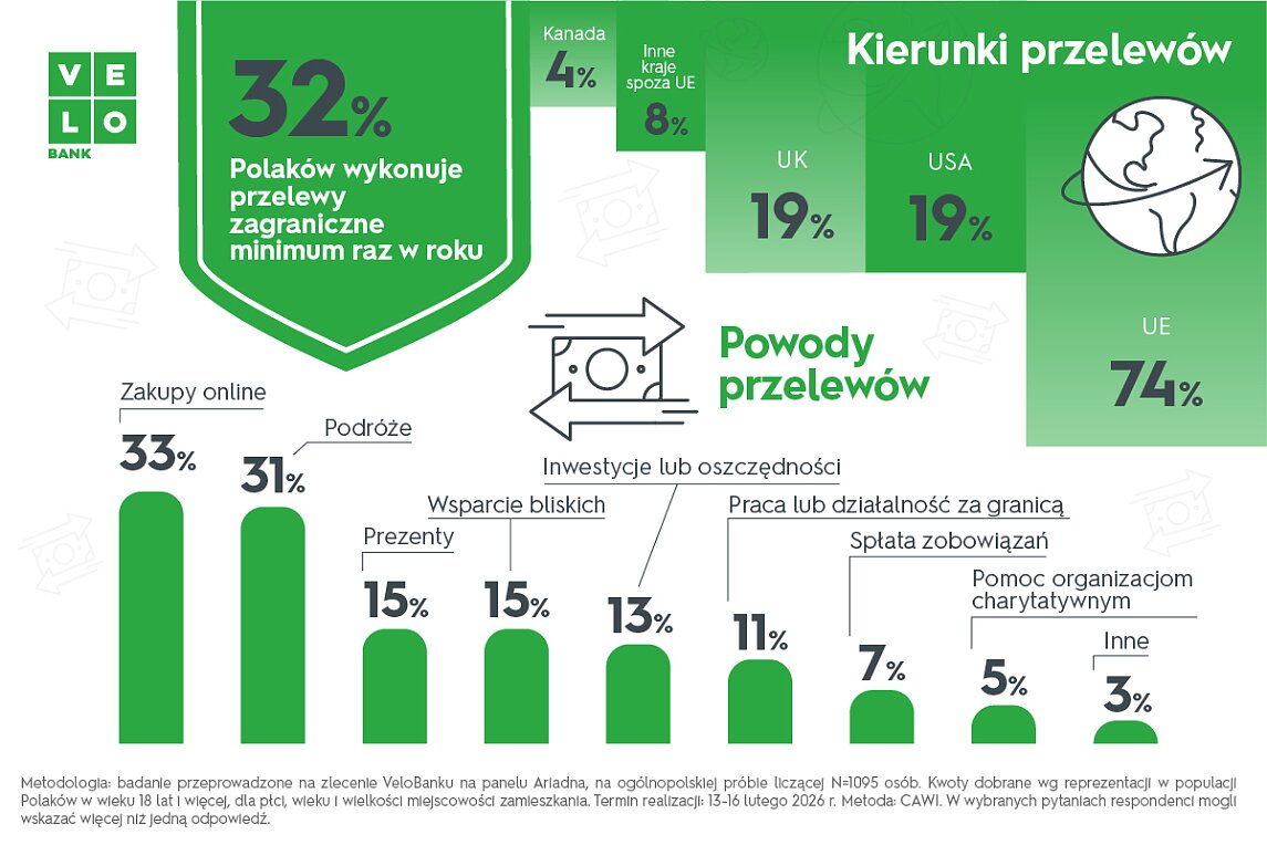 Jeszcze niedawno przelew zagraniczny był kojarzony ze wsparciem bliskich mieszkających za granicą lub z prowadzeniem działalności gospodarczej. Dziś korzysta z niego szersza grupa użytkowników, również w bardziej codziennych sytuacjach. Z badania przeprowadzonego na zlecenie VeloBanku wynika, że prawie jedna trzecia badanych (32%) wykonuje przelew zagraniczny co najmniej raz w roku. Główne powody? Zakupy w sklepach internetowych (33%), podróże (31%), prezenty (15%) oraz wsparcie finansowe bliskich (15%).