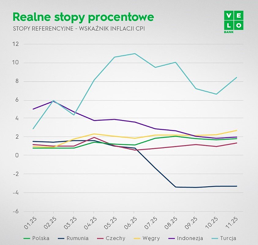 Kluczowym czynnikiem wspierającym waluty pozostają wysokie stopy procentowe, które nadal przewyższają poziom inflacji o około 1,5 punktu procentowego. Porównując realne stopy procentowe, czyli różnice między głównymi stopami referencyjnymi a wskaźnikiem inflacji, okazuje się, że wśród rynków rozwijających jest zbliżony poziom oddziaływania polityki monetarnej w granicach 1,5-2,5%. Tak jest w przypadku Polski, Czech, czy Indonezji. Nieco inaczej jest w przypadku Rumunii, gdzie od podwyżki podatku VAT i wzrostu inflacji w ostatnich miesiącach Rumunia mogłaby zdecydować się na zaostrzenie polityki monetarnej. Ostrą politykę ma Turcja, która od lat zmaga się z inflacją i w ostatnim czasie prowadzi bardziej ortodoksyjną politykę monetarną.