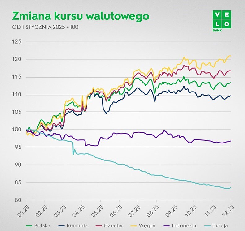 Polski złoty jest dziś w solidnej formie, ale to forint i korona rozdają karty w regionie. Waluty Europy Środkowej notują dwucyfrowe zwroty wobec dolara, bo lokalne banki centralne konsekwentnie trzymają kurs na wysokie stopy procentowe. Analiza zespołu ekonomicznego VeloBanku pokazuje, że to właśnie różnice w polityce monetarnej napędzają umocnienie regionu i utrzymują go w gronie najbardziej atrakcyjnych rynków wschodzących.