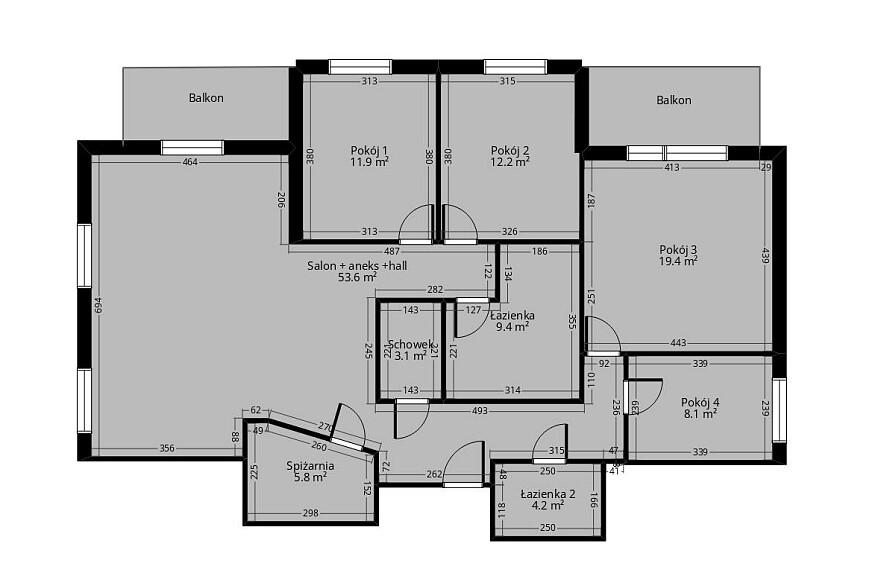 Pomieszczenia: 5 pokoi, 2 łazienki, spiżarnia, schowek, 2 balkony